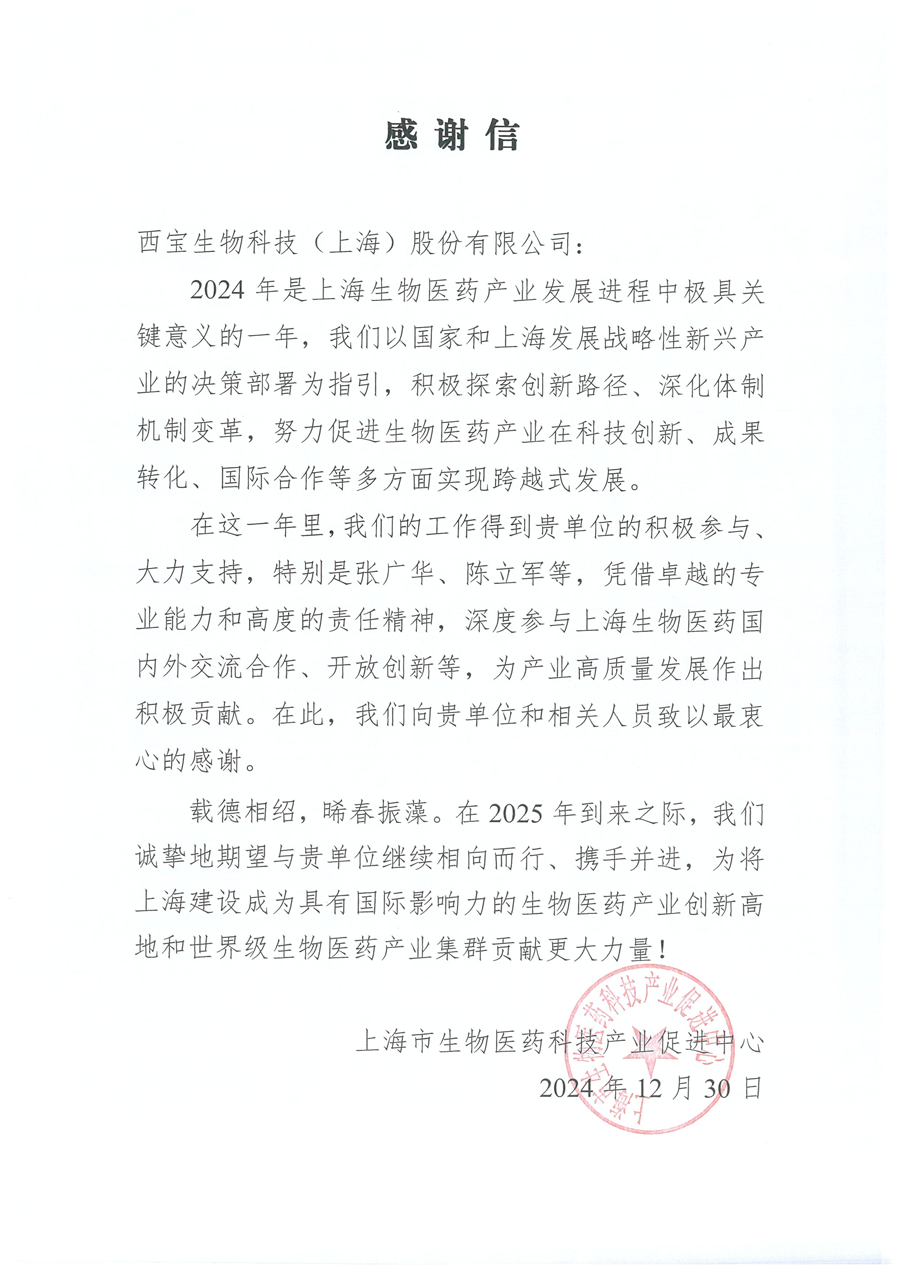 即將告別龍年,邁入嶄新的蛇年,在此之際,西寶生物收到一封來自上海市生物醫(yī)藥科技產(chǎn)業(yè)促進(jìn)中心特別的年終感謝信,紙箋傳情,雙向奔赴。