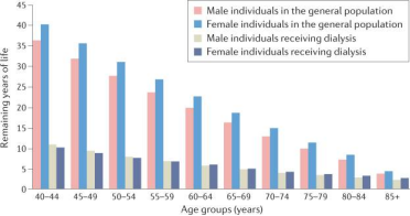 圖:2018年美國流行性腎衰竭人群和2017年普通人群的預期剩余壽命(單位:年)