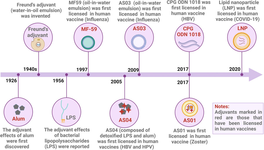 圖:疫苗佐劑研究史上重大事件的時間線[1]