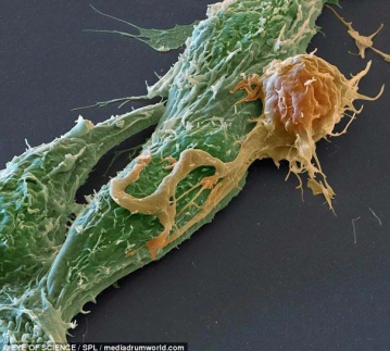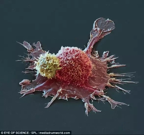 CAR-T細胞(黃色)正在攻擊乳腺癌細胞(粉色)