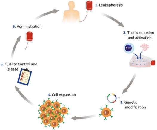CAR-T細胞治療全流程,包括采集病患或者健康供體的外周血單核細胞(PBMC)、T細胞分離激活,T細胞體外基因修飾,CAR-T細胞體外擴增,CAR-T細胞質量監控,CAR-T細胞回輸病患體內這些主要步驟。