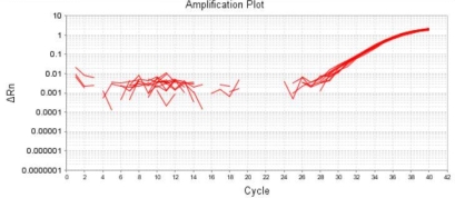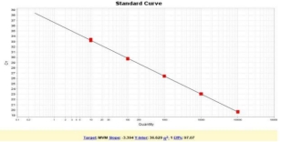 經(jīng)梯度稀釋MMV質(zhì)粒參考品測試,基因組拷貝數(shù)在105-10copies/μL時,本產(chǎn)品的R2=1,擴增效率97.07%