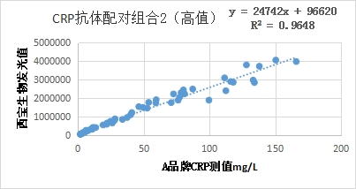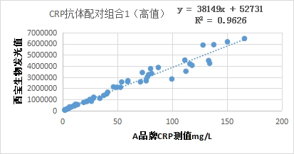 與A品牌CRP試劑臨床相關性R2>0.95;