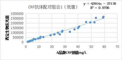 低值部分(≤60mg/L)與A品牌CRP試劑相關性R2>0.95。