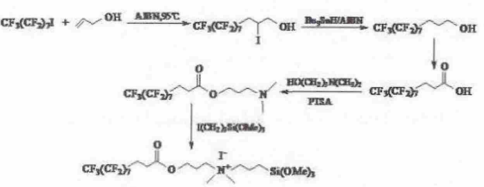 邵徽等合成了新型含氟烷基季按鹽,將其作為整理劑處理后的棉織物顯示出耐久的抗菌活性和極低的臨界表面能。合成路線如下[2]: