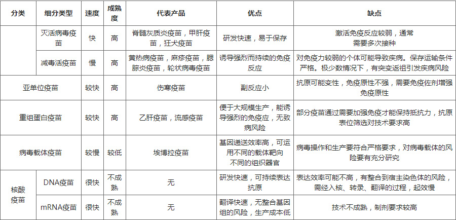 滅活病毒疫苗 | 快 | 高 | 脊髓灰質(zhì)炎疫苗,甲肝疫苗,狂犬疫苗 | 研發(fā)快速,易于保存 | 激活免疫反應(yīng)較弱,通常 需要多次接種 | |