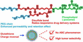 PEG修飾生物分子一般有主要的連接鍵有酰胺鍵、醚鍵、酯鍵和二硫鍵等等,不同的連接鍵性質(zhì)也會對PEG-Lipid在體內(nèi)的穩(wěn)定性,靶標內(nèi)濃度和釋放速度產(chǎn)生相應(yīng)的影響。例如研究人員針對腫瘤細胞的酸性環(huán)境,開發(fā)酸性環(huán)境中可裂解PEG-Lipid的連接鍵(半縮醛,pH敏感的苯甲酸酯等),或在PEG主鏈上插入酸性敏感的化學修飾(如-S-S-,硼酸酯等等)來增加載藥脂質(zhì)體在目標靶標中釋放藥物[12]- [14]。