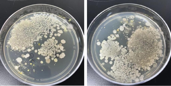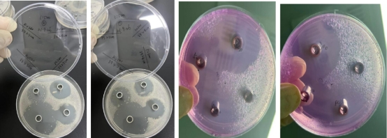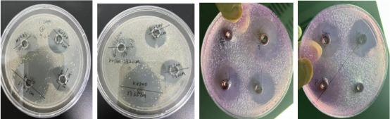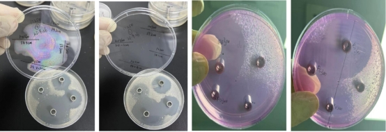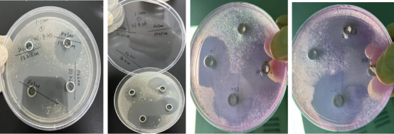 2、大豆酪蛋白板,KV500 的圈大,邊緣會有些菌帶,說明邊緣部分的抑制效果較弱。KV300 和PC300圈沒KV500 大,圈內干凈無菌落,說明對接種液內的細菌都有較好的抑制效果。