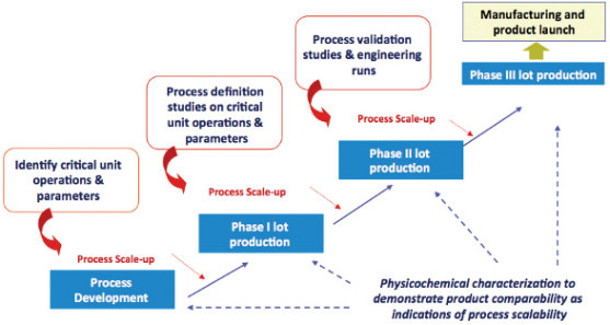 疫苗產品多樣且復雜,包括滅活或解毒疫苗;重組蛋白疫苗;腺病毒疫苗;及治療性疫苗等,圖1描述了原料藥疫苗工藝開發的通用方法。工藝開發從實驗室規模開始,用于確定單元操作和參數,然后逐步擴大規模(通常在20L發酵或細胞培養下),用于生產用于I期臨床研究的GMP材料。在擴展到200 L(通常用于第二階段)之前,使用實驗設計(DoE)對關鍵單元操作和參數進行過程定義研究。在第三階段(約2000L規模)之前,需要進行工藝驗證和工程運行。在工藝開發和放大過程中,進行生物物理和化學表征,以證明產品的可比性和工藝可擴展性。