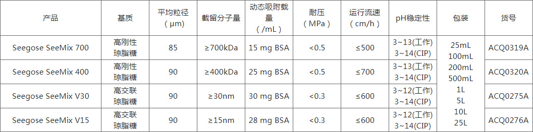 Seegose SeeMix V30 | 高交聯 瓊脂糖 | 90 | ≥30nm | 30 mg BSA | <0.3 | ≤600 | 3~12(工作) 3~14(CIP) | ACQ0275A | |