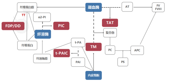 新凝血四項,又稱血栓前四項即TAT:凝血酶-抗凝血酶復合物,PIC:纖溶酶-抗纖溶酶復合物,TM:血栓調節蛋白,t-PAI-C:組織纖溶酶原激活物-纖溶酶原激活物抑制劑-1復合物。