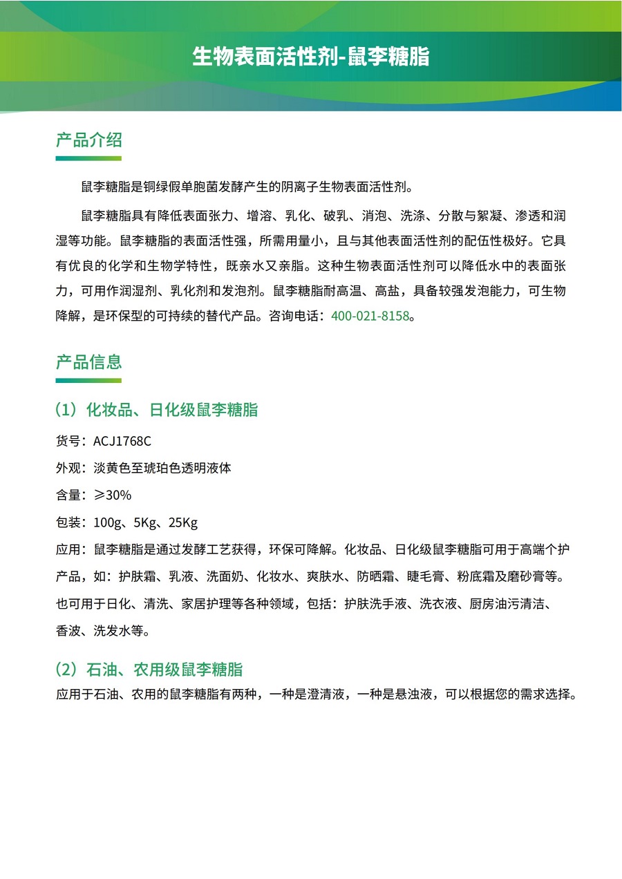 鼠李糖脂具有降低表面張力、增溶、乳化、破乳、消泡、洗滌、分散與絮凝、滲透和潤濕等功能。鼠李糖脂的表面活性強,所需用量小,且與其他表面活性劑的配伍性極好。它具有優良的化學和生物學特性,既親水又親脂。這種生物表面活性劑可以降低水中的表面張力,可用作潤濕劑、乳化劑和發泡劑。鼠李糖脂耐高溫、高鹽,具備較強發泡能力,可生物降解,是環保型的可持續的替代產品。咨詢電話:400-021-8158
