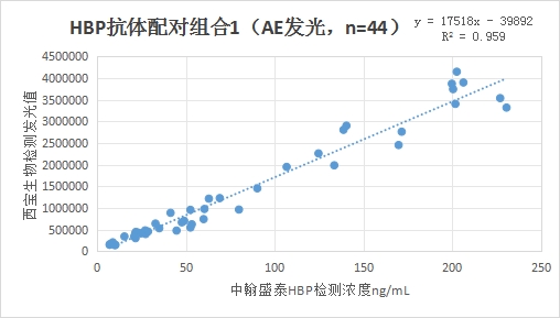 西寶生物發光(AE)平臺HBP抗體配對組合1與中翰盛泰HBP試劑(熒光免疫層析)賦值的臨床樣本相關性R2在0.95左右,相關性較好。