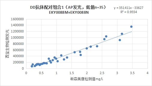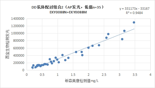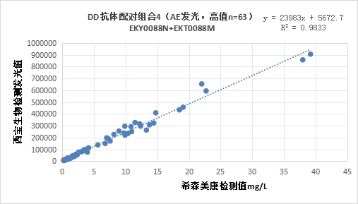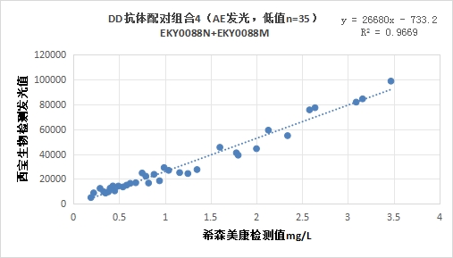 西寶DD抗體配對組合4(<4mg/L)的發光值與希森美康DD試劑臨床相關性R2在0.95左右;