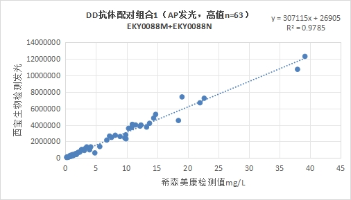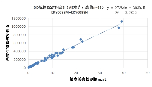 西寶DD抗體配對組合3(<40mg/L)的發光值與希森美康DD試劑臨床相關性R2>0.95。