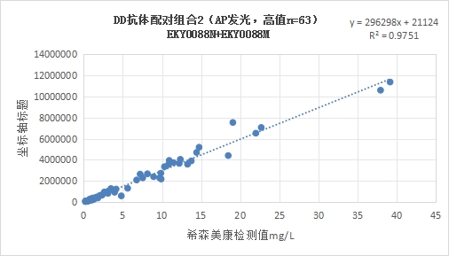 西寶DD抗體配對組合4(<40mg/L)的發光值與希森美康DD試劑臨床相關性R2>0.95。