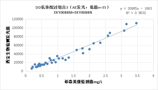 西寶DD抗體配對組合3(<4mg/L)的發光值與希森美康DD試劑臨床相關性R2>0.95;