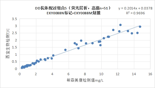 西寶DD抗體配對組合5(<15mg/L)的發光值與希森美康DD試劑臨床相關性R2>0.95。
