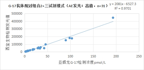 西寶生物發光(AE)平臺G-17抗體配對組合2(三試劑模式)與亞輝龍G-17試劑(化學發光法)賦值的臨床樣本相關性R<sup>2</sup>>0.95,相關性良好。