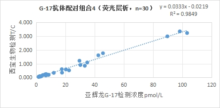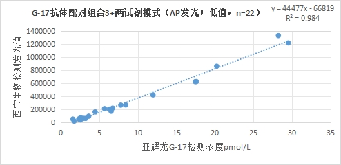 西寶生物熒光平臺G-17抗體配對組合5與亞輝龍G-17試劑(化學發光法)賦值的臨床樣本相關性R2>0.95,相關性良好;