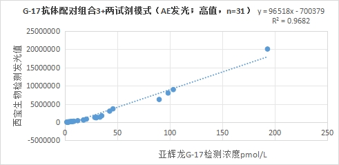 西寶生物發光(AE)平臺G-17抗體配對組合2(三試劑模式)與亞輝龍G-17試劑(化學發光法)賦值的臨床樣本相關性R2>0.95,相關性良好。